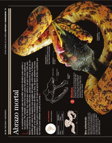 Dientes Busca la cabeza de sus víctimas para que no la ataquen. La toma con sus dientes delan- teros, los que, al ser curvos, impiden que la presa se deslice y así llevar a cabo la constricción: enrollar sus anillos alrede- dor del cuerpo y apretar.