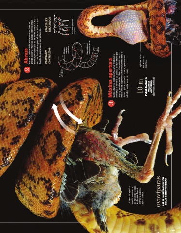 2 Columna vertebral. Máxima apertura Cuando la presa está muerta, afloja el abrazo y comienza a comerla. La cabeza es lo primero que traga y, gradualmente, libera el resto del cuerpo de sus anillos. Según el tamaño del animal será el tiempo que le demande comerlo: apenas unos minutos hasta una o dos horas.